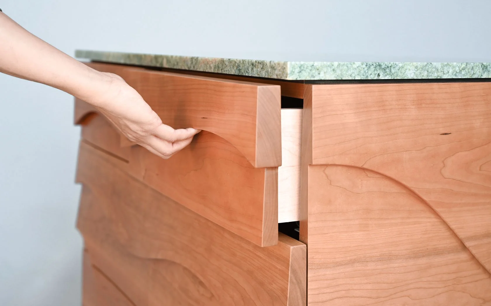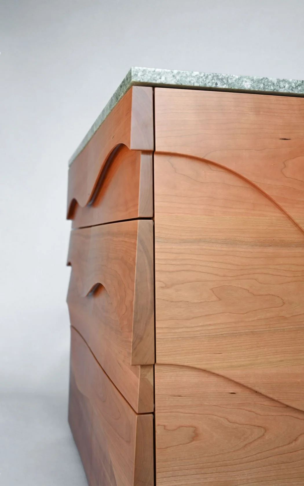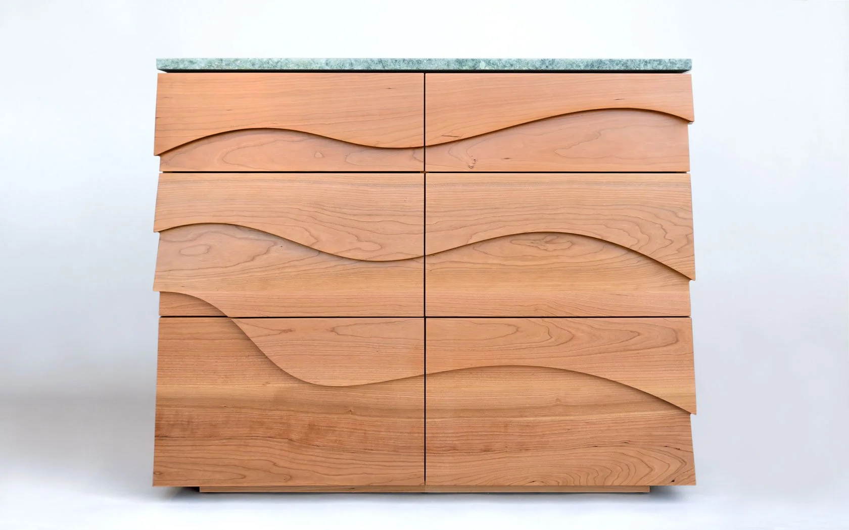 Melt dresser provides a generous volume that stands up to the use time in a busy household. The natural stone top offers durability and additional texture that highlights the surface as you approach the dresser. The lines that resemble the seascape gently flow from one side of the dresser to the other. Undercut finger grips are integrated into the curves for ease of use when opening the drawers.